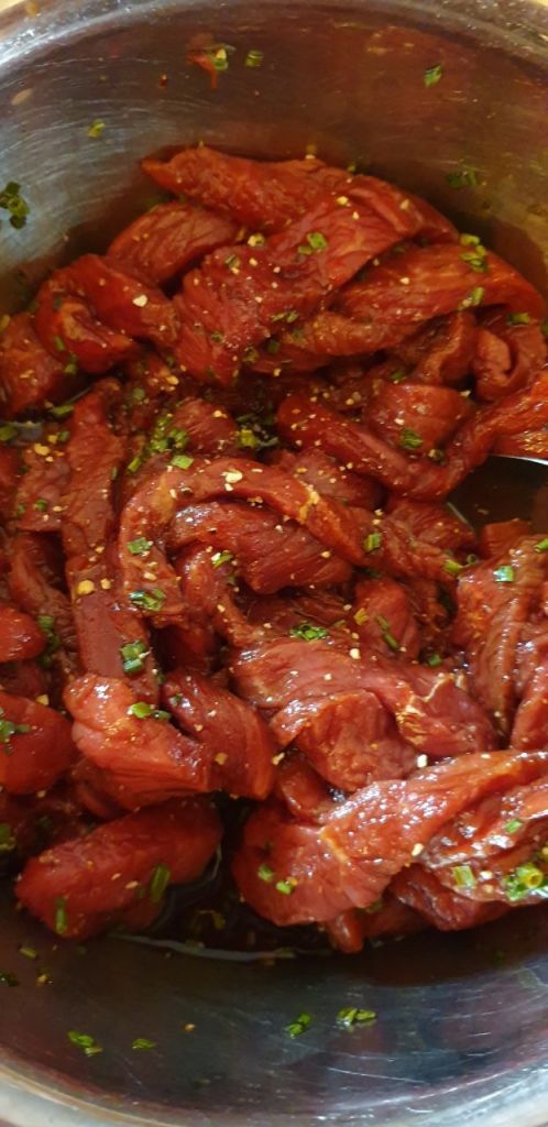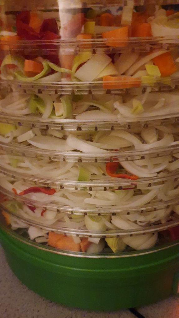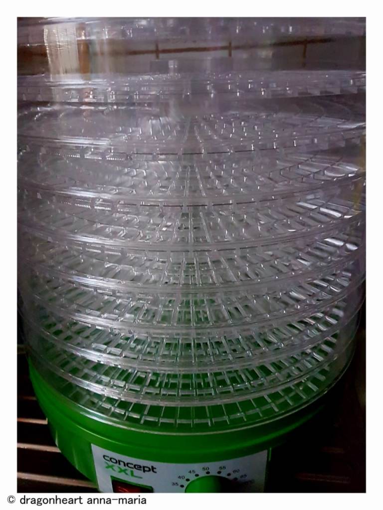 Dazu schneide ich das Gemüse klein und lege es zum Trocknen in meinen Dörrautomat.