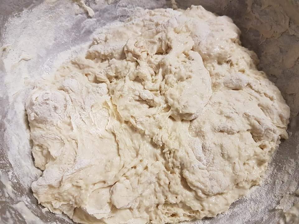 die Hefe mit dem lauwarmen Wasser vermischen und wenn es sich vollständig aufgelöst hat und zum Mehl geben,