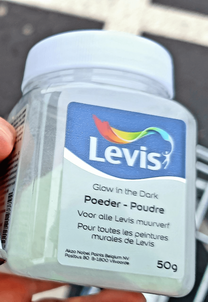 So, gerade aus dem Baumarkt zurück. Konnte mich nicht entscheiden, ob es im Dunkeln leuchten oder am Tag glitzern soll, deshalb habe ich einfach beide genommen.
