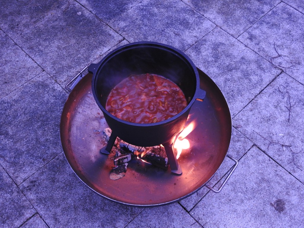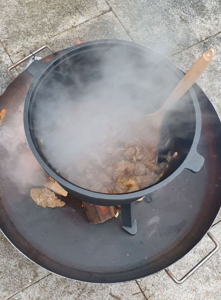 Danach alle Zutaten für den Gulasch nach und nach in den Topf gegeben und anschmoren lassen, mit gutem Wein abgelöscht und dann ziehen lassen.