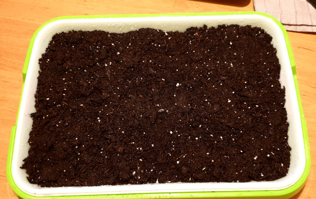 Habe die Keimschale leicht mit Erde befüllt und mit der Sprühflasche nass gemacht.