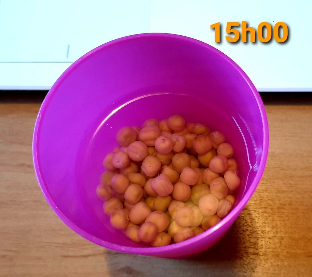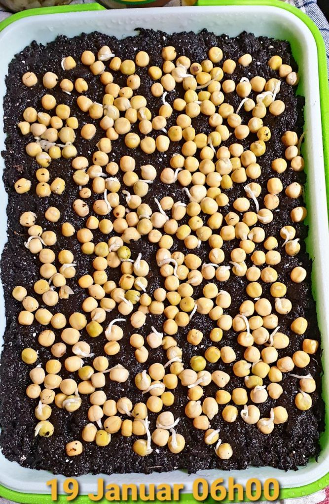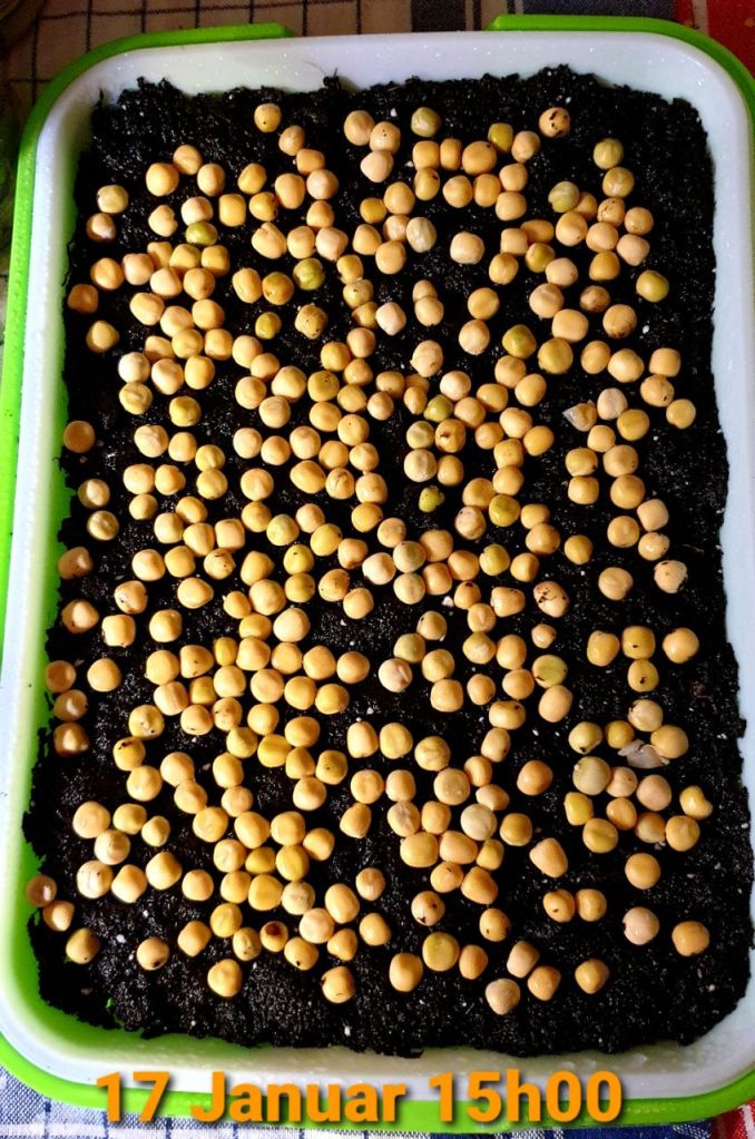 Aber zuerst einmal müssen die Erbsen für ca. 10-12 Stunden eingeweicht werden und nach 8-14 Tagen kann dann geerntet werden.