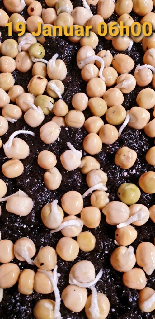 Dies dient dazu, dass die Erbsen gleichmässiger keimen und gleichzeitig dazu gezwungen werden die Wurzeln nach unten zu richten.