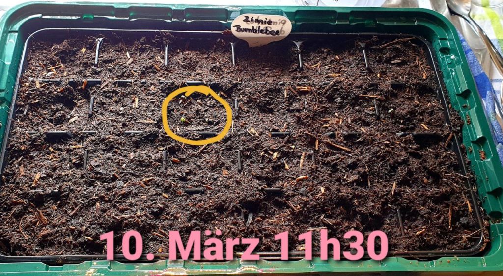 Ausserdem habe ich Zinnien der Sorte „Bumblebee“ angesät, die heute schon keimen…