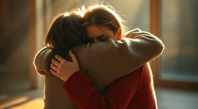 - „Du darfst alles fühlen.“ Deine Trauer, deine Wut, deine Verzweiflung – sie sind in diesem Moment nicht nur erlaubt, sondern willkommen. Du musst dich nicht erklären oder etwas verstecken. In dieser Umarmung darfst du zerbrechlich sein.