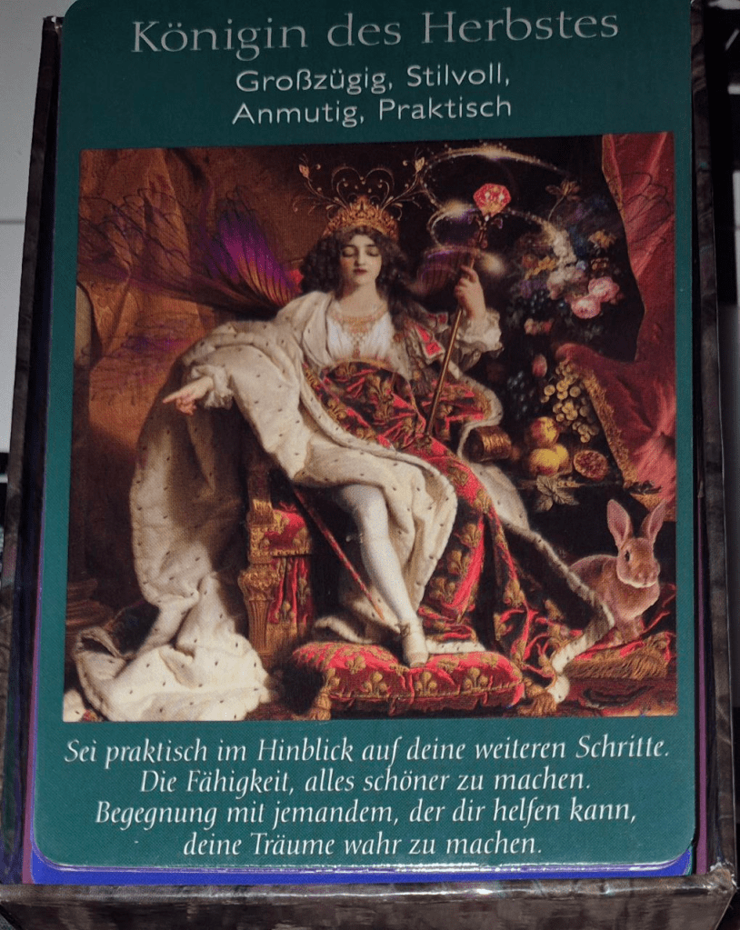 Die Königin des Herbstes sitzt auf ihren Thron. Sie mag den Eindruck erwecken, untätig zu sein, doch ist sie umschwirrt von Magie. Der Hase an ihrer Seite symbolisiert den Wohlstand und die Kreativität, über die sie verfügt.