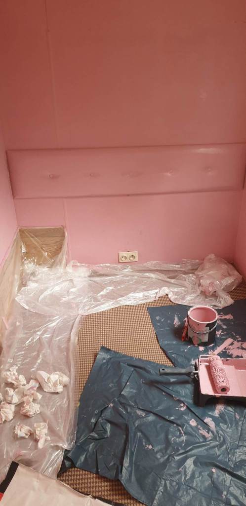 Obschon dieses Zimmer wirklich winzig ist, hat es mich wirklich sehr viel Zeit gekostet, anzustreichen. Da die Möbel fest installiert sind, ist es schwierig überall dran zu kommen, besonders wenn man ein paar Kilo zu viel auf den Rippen hat.