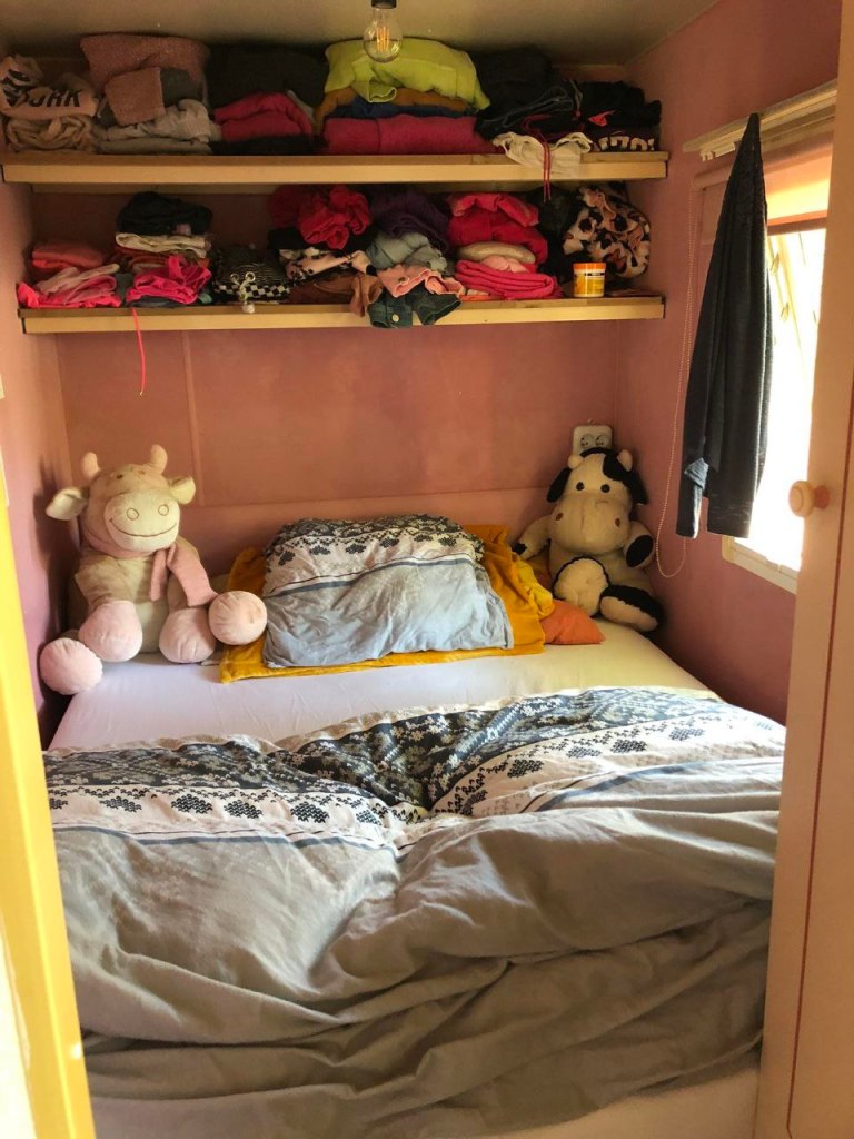 Ein normales Bett hätte in dieses Zimmer gar nicht erst reingepasst. Ein normales Bett hat ja eine Länge von 200 cm, dieses hier durfte aber nur 180 cm lang sein. Mit ein wenig Hilfe, passt dieses selbst gebaute Bett nun perfekt in dieses Zimmer.