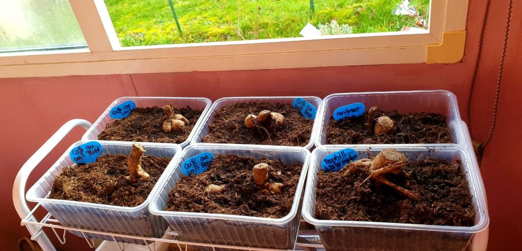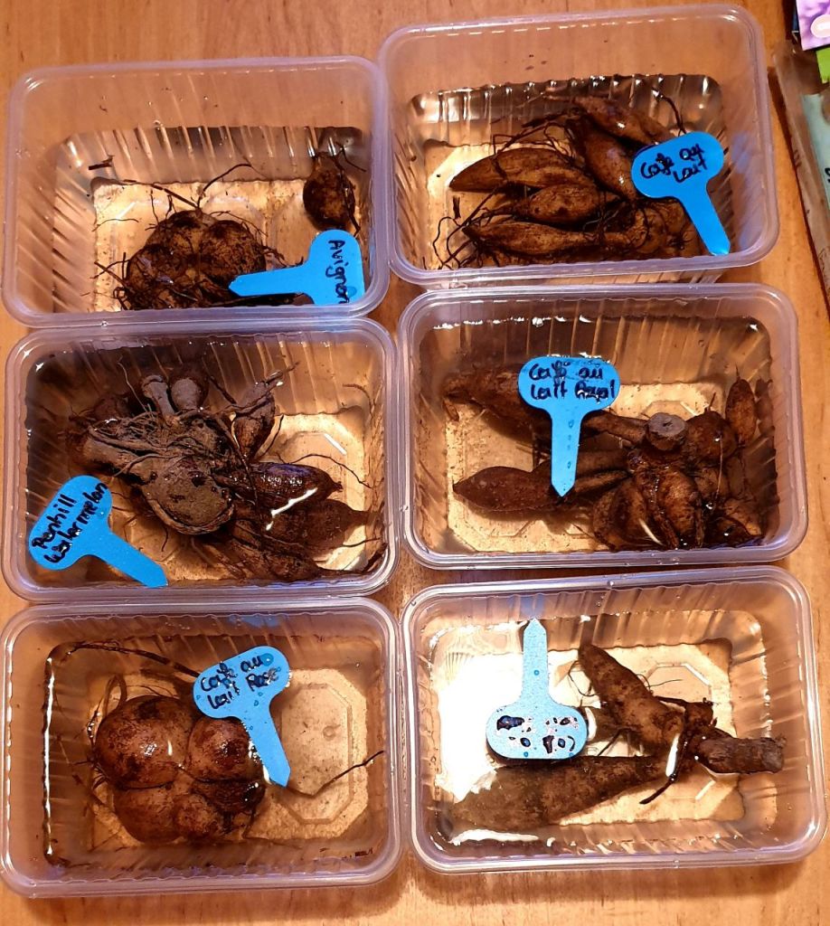 Damit die Knollen ihre Wasserreserve wieder aufbauen können, lege ich sie eine Stunde ins Wasser, bevor ich sie in die Erde bringe und erst einmal auf die Fensterbank stelle.
